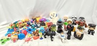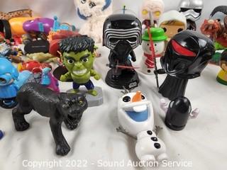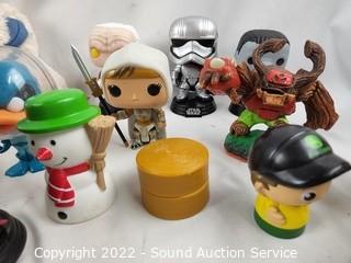 Lot Details: Bag has reversible sequins. 11" H x 10" x 10". Various Star Wars Funko bobbleheads, Riot Games & others, refer to photos for lot contents.