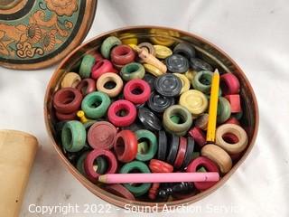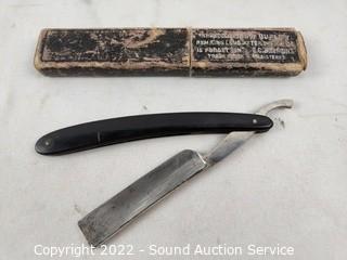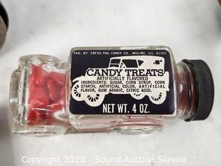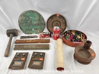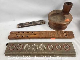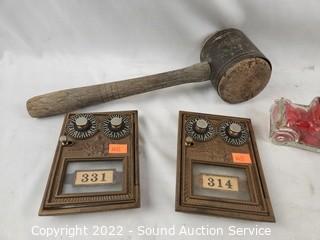 Lot Details: Wood & brass mallet, handcrafted carved wood flute, Vtg. Straight razor, 1930's Candy Treat Car, Lyons Addometer calculator, combination mail box doors 5" x 3.5", Wood ashtray, and more.