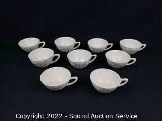 Lot Details: Discontinued pattern. 10 dinner plates, 10 berry bowls, 10 saucers, 9 cups, 6 snack plates, 8.75" serving bowl, 12" platter. Gold trim shows signs of wear, no other issues.