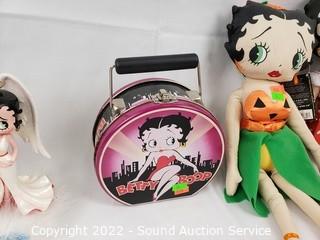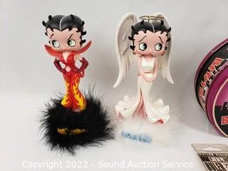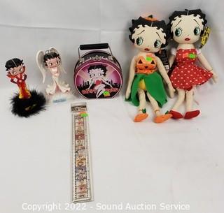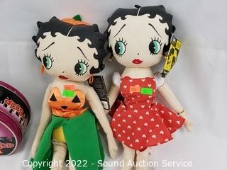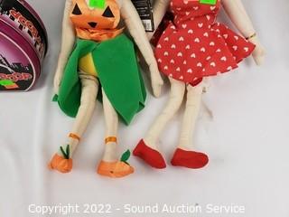 Lot Details: 2 plush dolls, 2 bobble heads, tin lunch box, ruler.