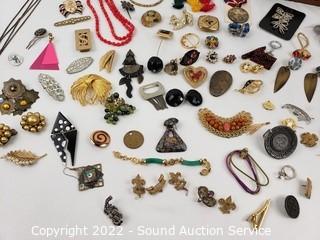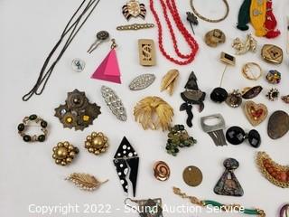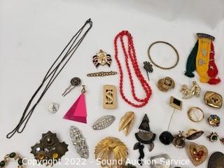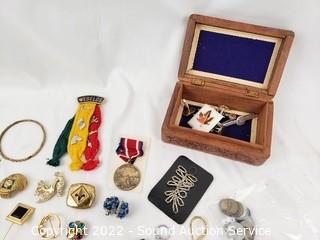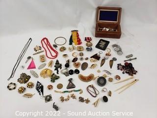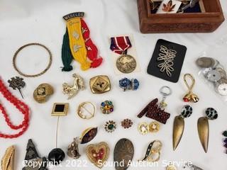 Lot Details: Brooches, cufflinks, carved wood box, tokens, bracelets, earrings, pins.