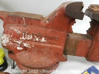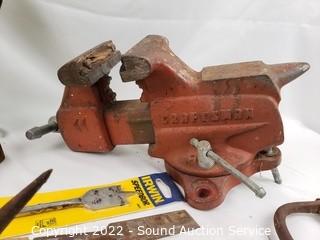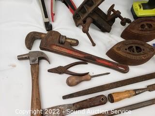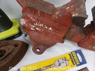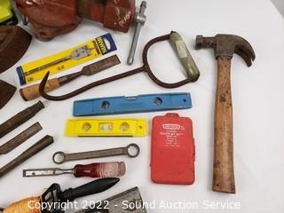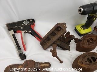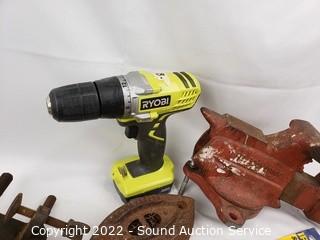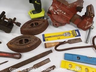 Lot Details: 3.5" jaw vise, Ryobi 12v cordless drill (works, no charger), sad irons, hay hook, level & more. Refer to photos for lot contents.