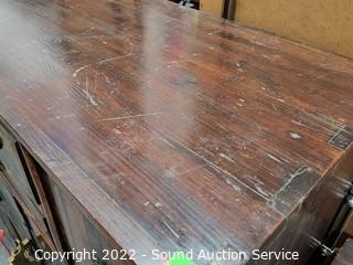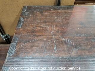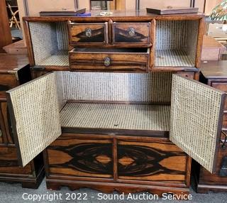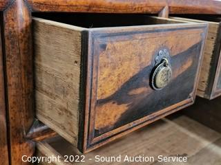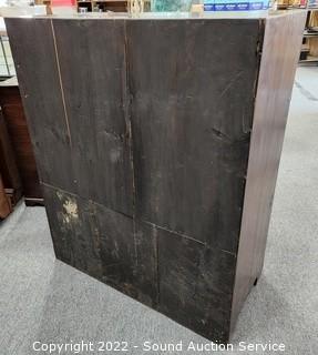 Lot Details: Solid wood construction, brass hardware. Removable panels hidden storage. Old patina finish, some wear from age & use, looks old. 45" H x 37" W x 18" D.