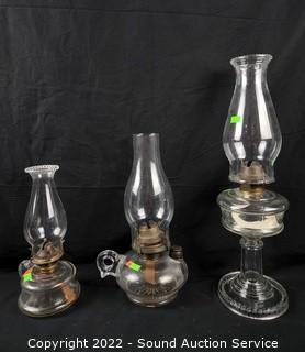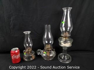 Lot #0069: 3 Vintage Clear Glass Oil Lamps w/Chimney's