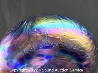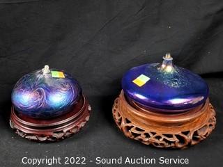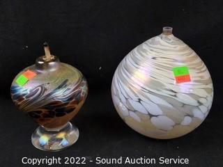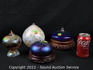 Lot Details: 2 signed on bottom, one Blacksheep glass, other hard to make out, has some oil in it. 2 Wooden stands. 2.5" to 6" H x 3.75" to 5.5" Dia. 3 with wood stands.