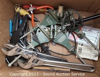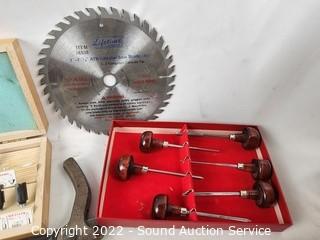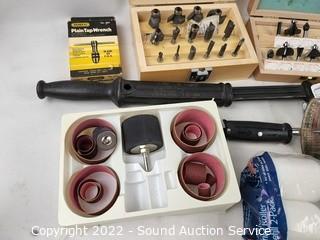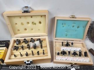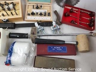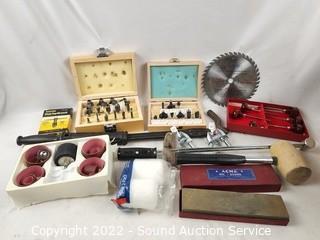 Lot Details: 2 Router bit sets (appear unused), drum sanding bits, tap wrench, jigsaw blades, adjustable wrenches, nail puller & more.
