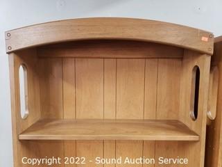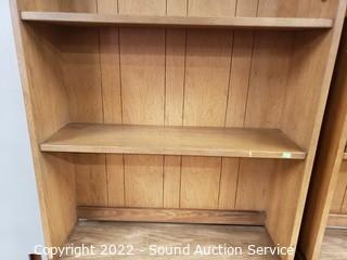Lot Details: Appears to be solid wood construction with laminate finish, dovetail joinery. Overall 75" H x 30" W x 9" to 19" D. Don't see any major issues, light scuff on one shelf. Matches the next lot.