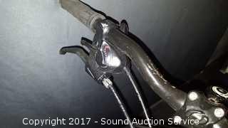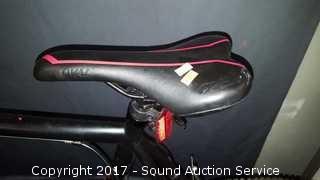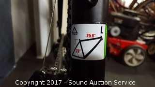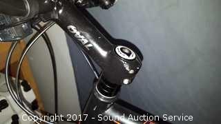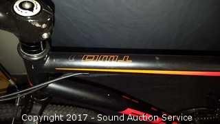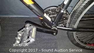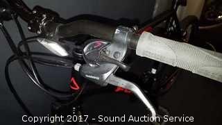 Has 26" tires. Oval grips, handlebars and seat. Shimano 21 speed smooth shifting system. Clicks when you change gear. Cantilever brakes. Front end shocks. Stands 34" to bar. Aluminum frame. Very light. Very nice and clean. Has a few scuffs on the handlebar and frame. In overall very good condition. 24.5" from center of crank to seatpost.