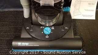 12amp. Cyclonic cleaning system. Comes with manual and all the attachments. Includes pet and upholstery attachment. Black and baby blue.