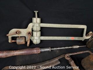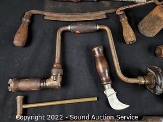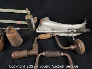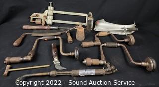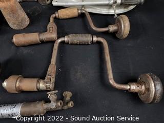 Lot #0252: Vtg. Braces, Hand Drills, Torch Head, Bell