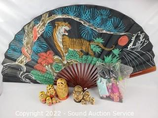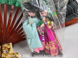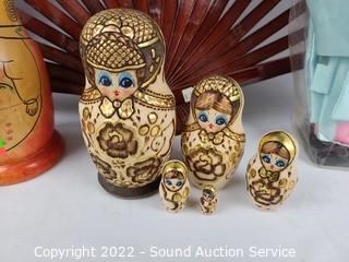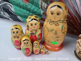 Lot #0233: 2 Russian Nesting Dolls, Asian Dolls & Fan