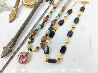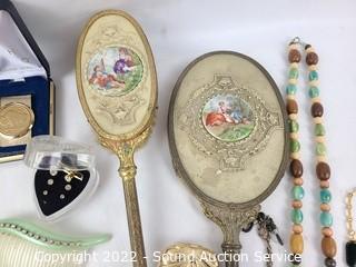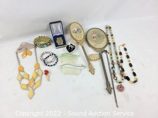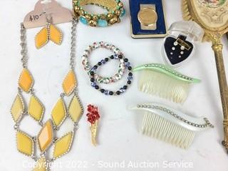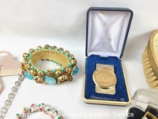 Lot #0207: Vtg. Brushes, Fashion Jewelry, Money Clip & More