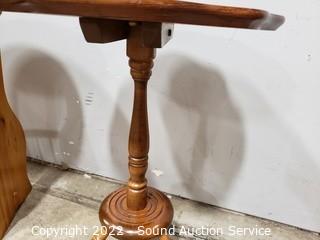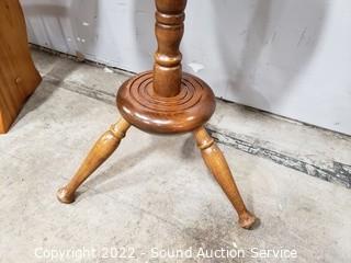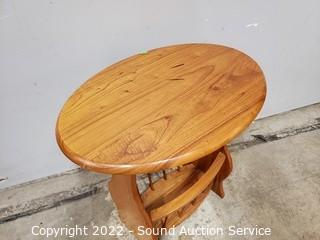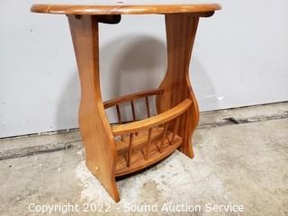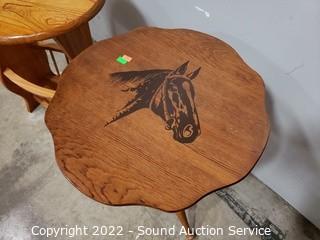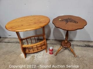 Lot Details: One has a horse print flip top, scalloped edge, 21.5" H x 16" Dia. Other has a built magazine rack in the base, 22" H x 22" x 16". In excellent cosmetic condition.