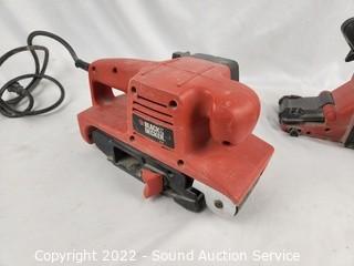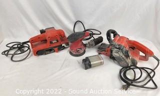 Lot Details: Black & Decker BR400, Black & Decker DS321 3x21" belt sanders, Skil 7490 orbital sander. All work.