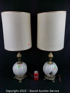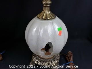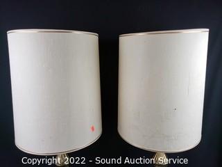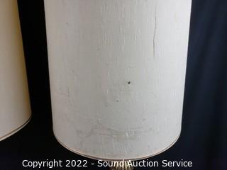 Lot Details: One has a bad socket inside of the base, main socket works. One has broken glass base. Shades have some damage. 34" T x 13" diameter shades.