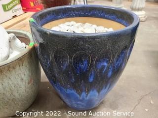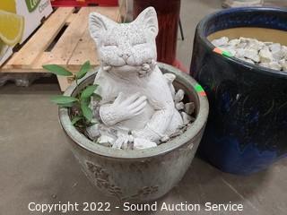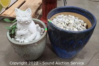 Lot #0352: 2 Glazed Pottery Planter Pots & Concrete Cat