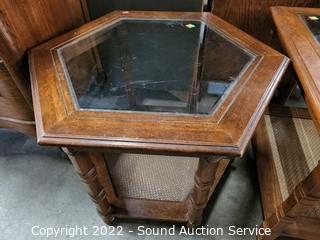 Lot Details: Some wear to the finish, scuffs, scratches, scratches on glass. Could use a good cleaning. 21" H x 21" x 27" & 21" H x 24" Dia Hexagon.