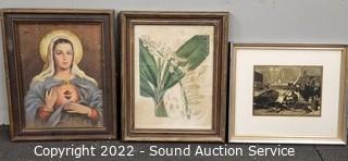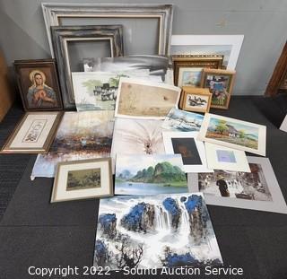 Lot Details: Originals, lithograph prints, some frames. 6" x 8" to 20" x 24". 2 nice wood large artwork frames fit 12" x 16" & 28" x 22".