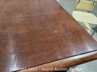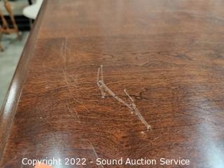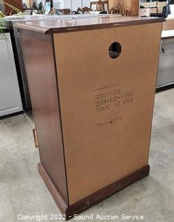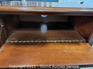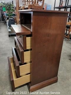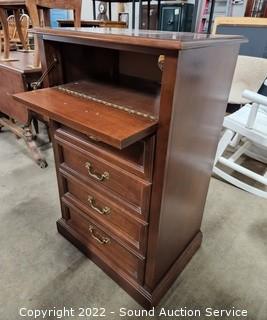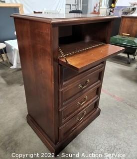 Lot Details: Top drawer is drop front for hidden components & cord hole, does not like to stay up. Some scuffs, scratches, wear to finish. 41" H x 26" W x 18" D. Wood fronts, particle board construction, cherry veneer.