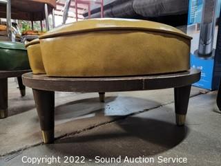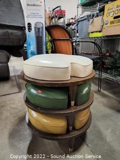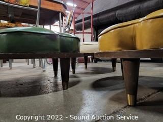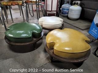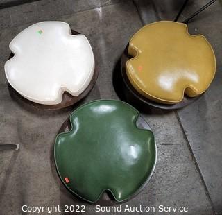 Lot Details: Green, ivory, yellow. each stool is 9" H x 18" Dia. Some wear to the wood finish. Don't see any issues with vinyl.