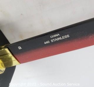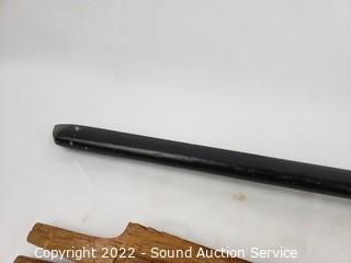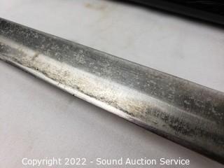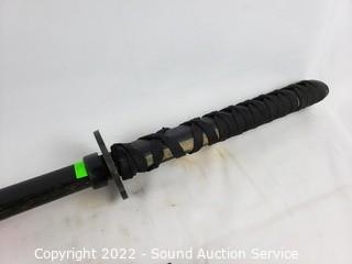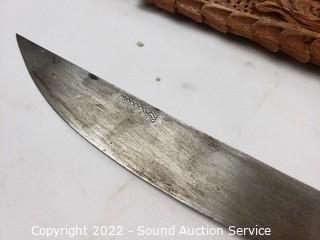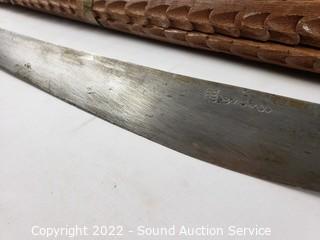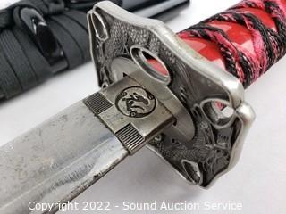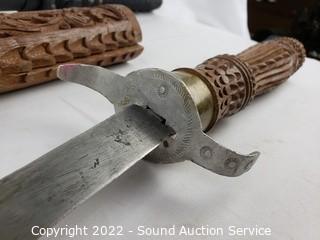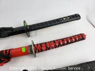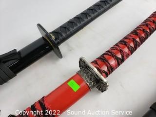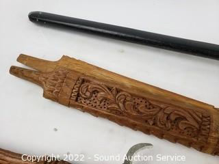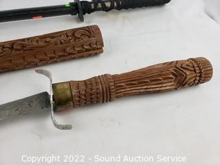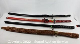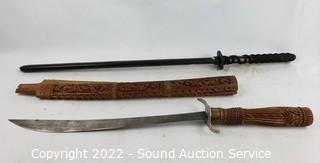 Lot Details: 2 Katana's, made in China, 39" & 41" L. Decorative handcrafted carved wood Thai sword, missing metal bands holding sheathe together, 37" long overall. 38" training sword.