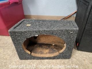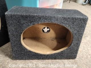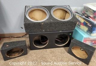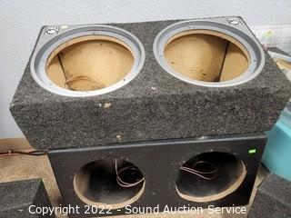 Lot Details: Dual 12" sub box, Dual 9.5" sub box, (2) 6x9 speaker boxes. Various wear, dings, holes in carpeting, some chunks missing from boxes.