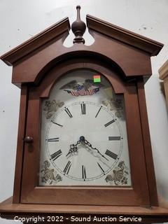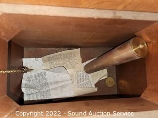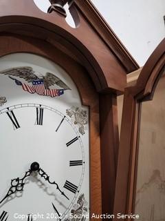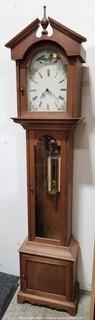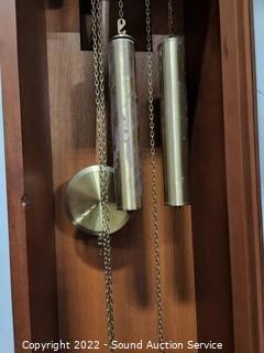Lot Details: 3-weights, one weight is damaged, and chain missing links, Looks like pull part is being held together by string, Appears to be functioning with out the one weight. Door to clock face is loose. 76" H x 17" W x 9.5" D.