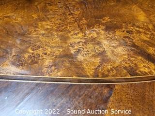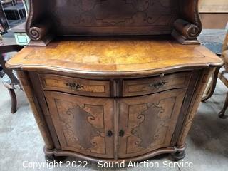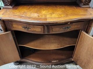 Lot Details: 2-drawers,lower cabinet. Skeleton key locks, no keys. Mahogany Burl veneer finish. Solid wood construction, veneer finish. Ornate carved accents. 70" H x 51" W x 26" D. Some veneer & trim missing. 2pc for easy movement.