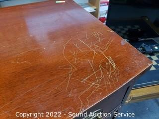 Lot Details: Various scuffs, scratches, wear to finish. 53" H x 36" W x 18" D. Solid wood construction, dovetail joinery.