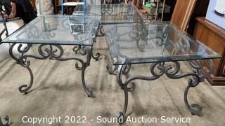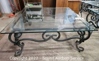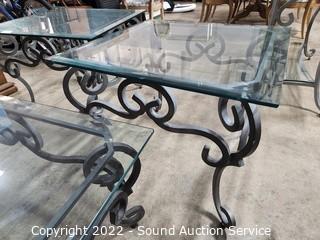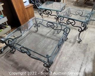 Lot Details: Coffee table and 2 end tables. Heavy, solid wrought iron bases, 1/2" thick beveled glass tops. 18" x 40" x 40" coffee table, 22.5" x 28" x 28" end tables. Matches the previous 2 lots.