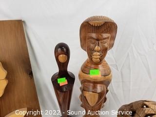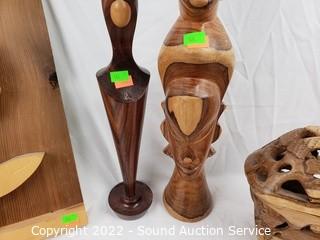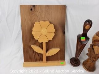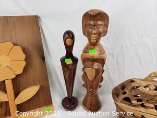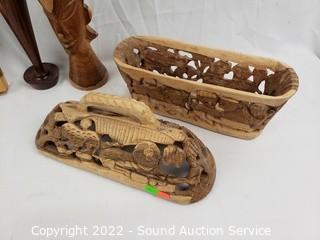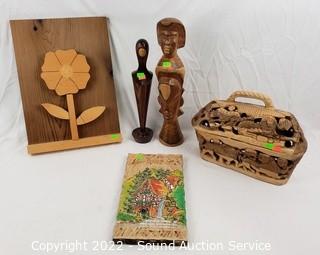 Lot #0144: 5pc Carved Wood Figures, Decor, Noah Basket