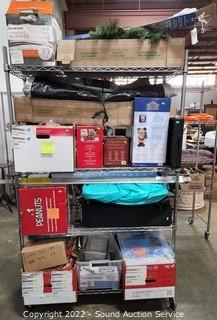 Lot Details: Cart NOT included. All items have some sort of damage or not function, all as is. Sandals, suit case, holiday decor, power popper, air mattress, holiday decor, snorkeling set, heated blankets, Instacrate & more. Refer to photos for lot contents.
