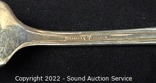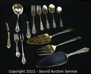 Lot Details: Comes with several silverware storage bags. Weight does not include butter knives, spreaders or cake knife (only handles are sterling). Sterling TW: 2lb 7oz or 55oz. Includes, 6 spreaders, 8 butter knives, ladles, cake knife, serving fork, 4 teaspoons, appetizer fork, child's fork, 14 small spoons, 13 small forks, 7 large forks.