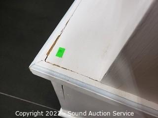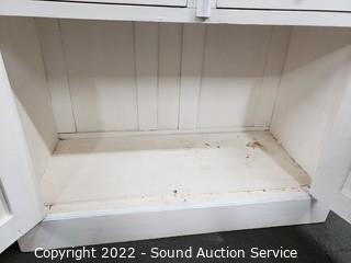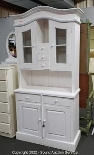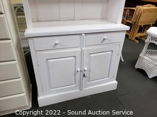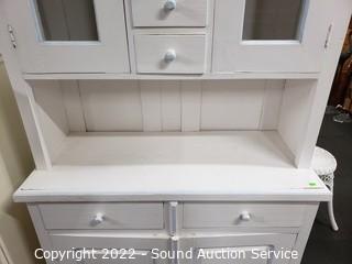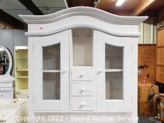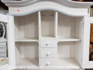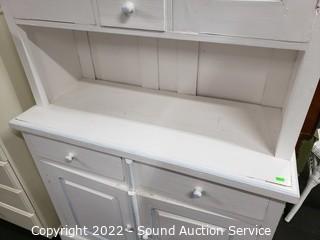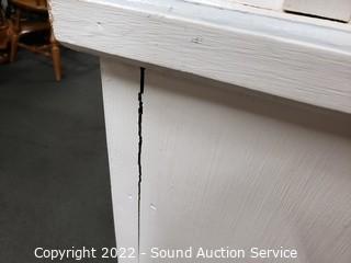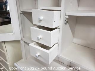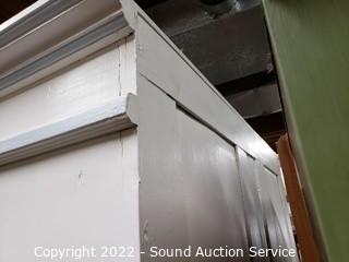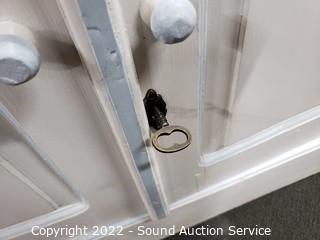 Lot Details: 1 Piece. Some wear to finish, crack on lower cabinet door, separating on trim. 77" H x 36.5" W x 11.5" to 16" D. Bottom cabinet, skeleton key lock with key.