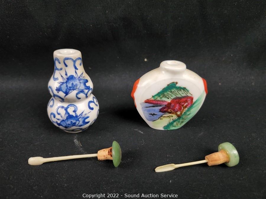 Lot Details: 2 Jade, ceramic, cinnabar, hand painted. 5 have intact scoops. 1 missing the scoop, one missing cap has scoop. Up to 2.5" tall.