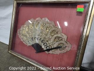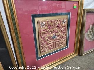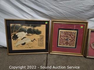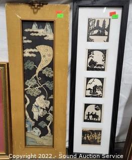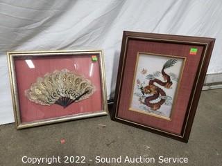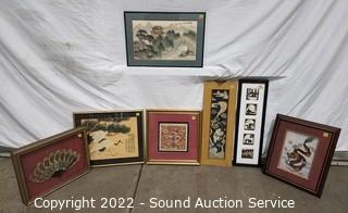 Lot Details: Gold silk embroidered tapestry, dragon art, original watercolors, unique handcrafted fan in shadowbox, silhouette & batik artwork. One has cracked glass. 13" x 16", 15" x 17", 7" x 23".