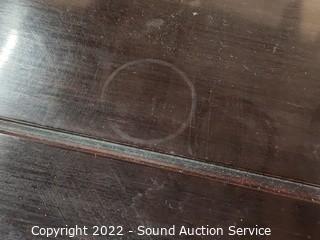 Lot Details: Some wear to the finish, one stool's top is loose. Stools come with cushions (have some wear, dirty spots, stains). 14" x 36" x 36" with (4) 13" x 11" x 11" stools.