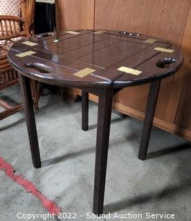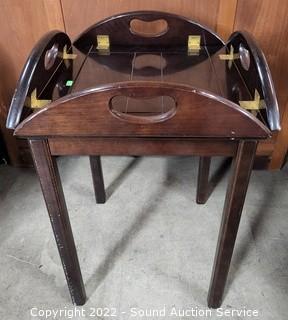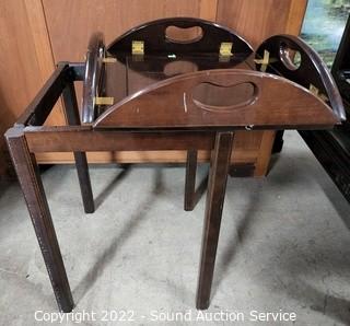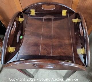 Lot Details: Sides of tray fold down to become a table, or lift up with handles to be a tray. Overall 27" x 18" x 18". Stand has some paint residue on it.