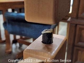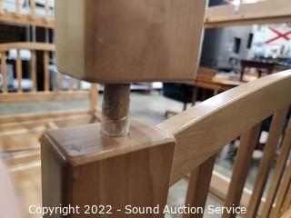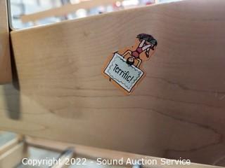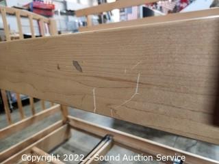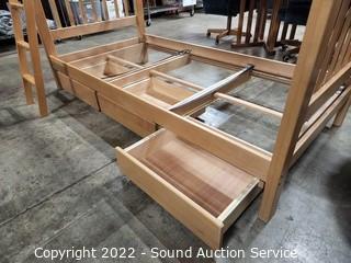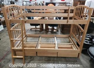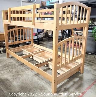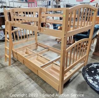 Lot Details: Missing 2 dowels to hold the top bunk up, we put 2 temporary dowels in wrapped in tape to fit the sockets. In great cosmetic condition, storage drawers on bottom. Overall 59" T x 40" W x 78.5" L.