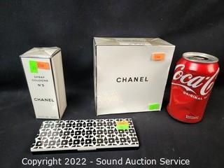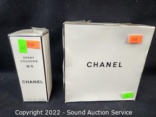 Lot Details: Chanel is No.5, both powder and cologne are sealed. Eyeshadow appears unused.