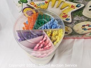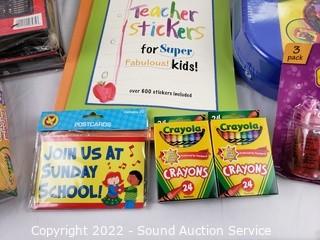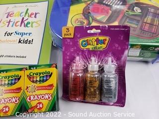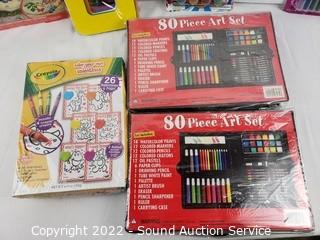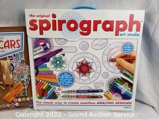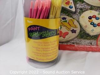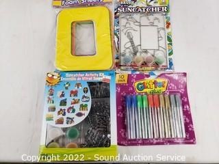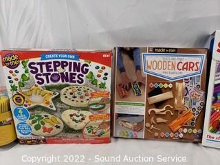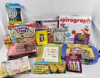 Lot Details: Spirograph, Crayons, Paint Brushes, Create Your Own Wooden cars, Stepping Stones, 2 Art Supplies Kits, Foam Sheets, Glitter Glue. A couple are sealed, others unknown completeness.