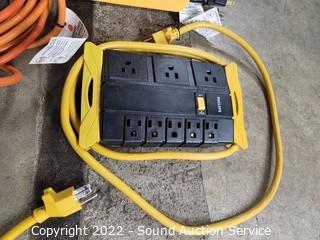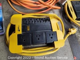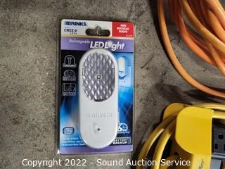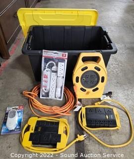 Lot #0190: Tote, Extension Cords, Power Strips & LED Light