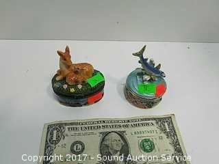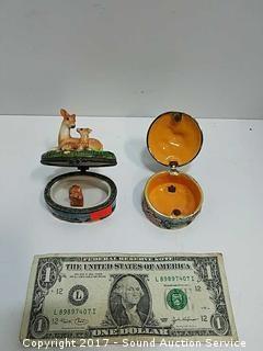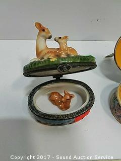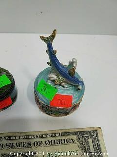 Enamelware has $60 price tag, hammerhead shark in the sea, gemstone encrusted, has a K on top of a D and a crown embossed maker's mark, refer to photos. Approx. 3" tall, 2" diameter. Porcelain trinket box comes with a little porcelain Bambi figurine.