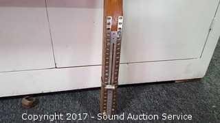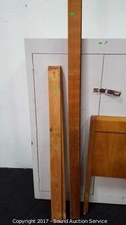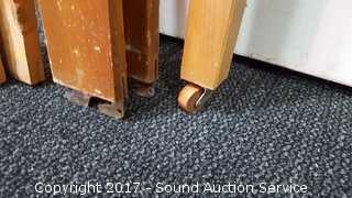 One of the legs has been repaired so the railing fits it. From what I can tell there's nothing wrong with the leg. Approx. 56" wide and 37" tall headboard, 24" tall footboard. Both are on wooden castors. Headboard is missing a castor.