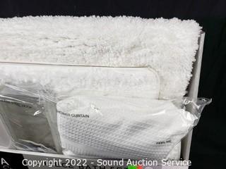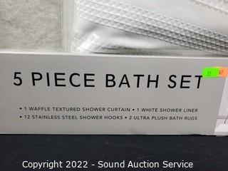 Lot Details:  1 waffled shower curtain, 1 white shower  liner, 2 ultra plush bath rugs, 12 shower  hooks.