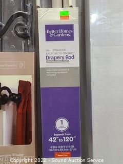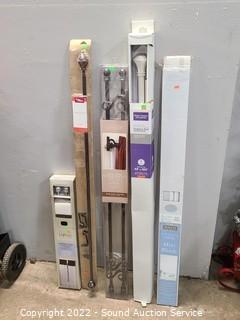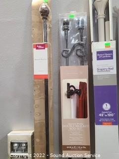Lot Details: All in original packaging. Ivory 1" x 42" to 120", black 5/8" x 48" to 86", Window in a box, 2 black & white curtains with rod 42" x 84" curtains, 25" to 48" rod, Black 0.625" x 48" to 84" rod.
