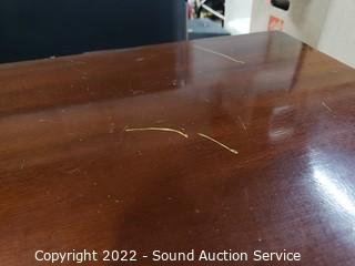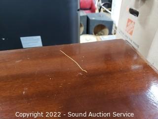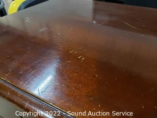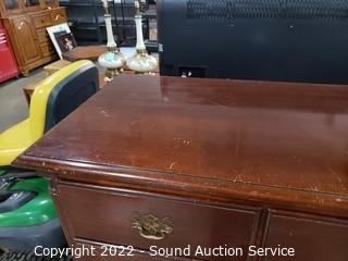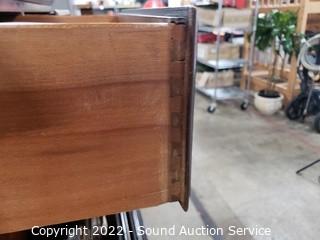 Lot Details: Appears to be solid wood construction, dovetail joinery. Some scuffs, scratches in finish, missing left front caster. 47.5" x 36" W x 19" D.
