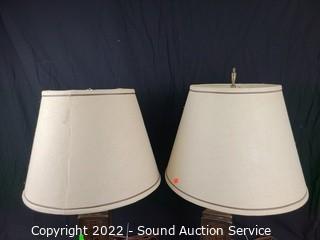 Lot Details: Couldn't get one to turn on , possibly a bad socket, other works. Some wear to bases, shades. 26" H x 4" bases, 14" dia shades.