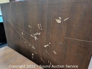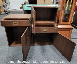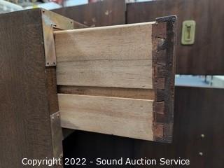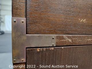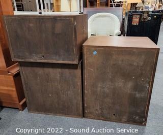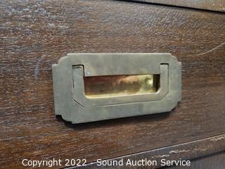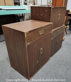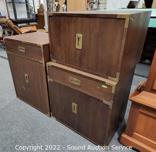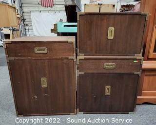 Lot Details: Brass accents & hardware. Appears to be solid wood construction, dovetail joinery possibly veneer finish. some scuffs, scratches, dings in the finish. Stackable. 23" H x 23.5" W x 18" D, 15" H x 23.5" x 18" & 30" H x 23.5" QW x 18" D.
