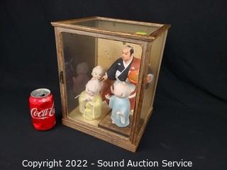 Lot Details: Wood framed glass display. 5.5" to 9" tall hand painted figures. Don't see any makers marks.